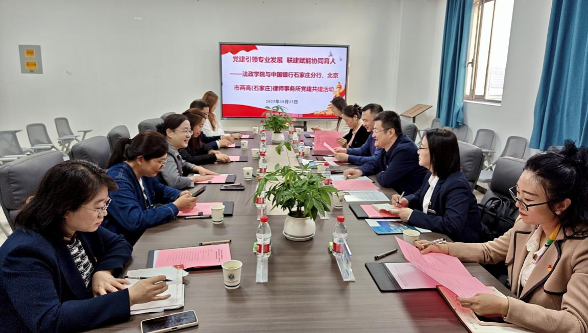 为深化党建引领下校银、校所合作,推动专业发展与人才培养深度融合,2025年10月15日,河北地质大学法政学院携手中国银行石家庄分行、北京市两高(石家庄)律师事务所,举办“党建引领专业发展联建赋能协同育人”主题党建共建活动,共话合作、共商发展。中国银行河北省分行副行长兼石家庄分行行长王德青、裕华支行副行长史征,北京市两高(石家庄)律师事务所管委会主任王建东、党支部书记范柳梅,法政学院党委书记董莉、副书记朱晓玲、法学系主任葛丽明及各党支部书记、部分教师参加了活动。