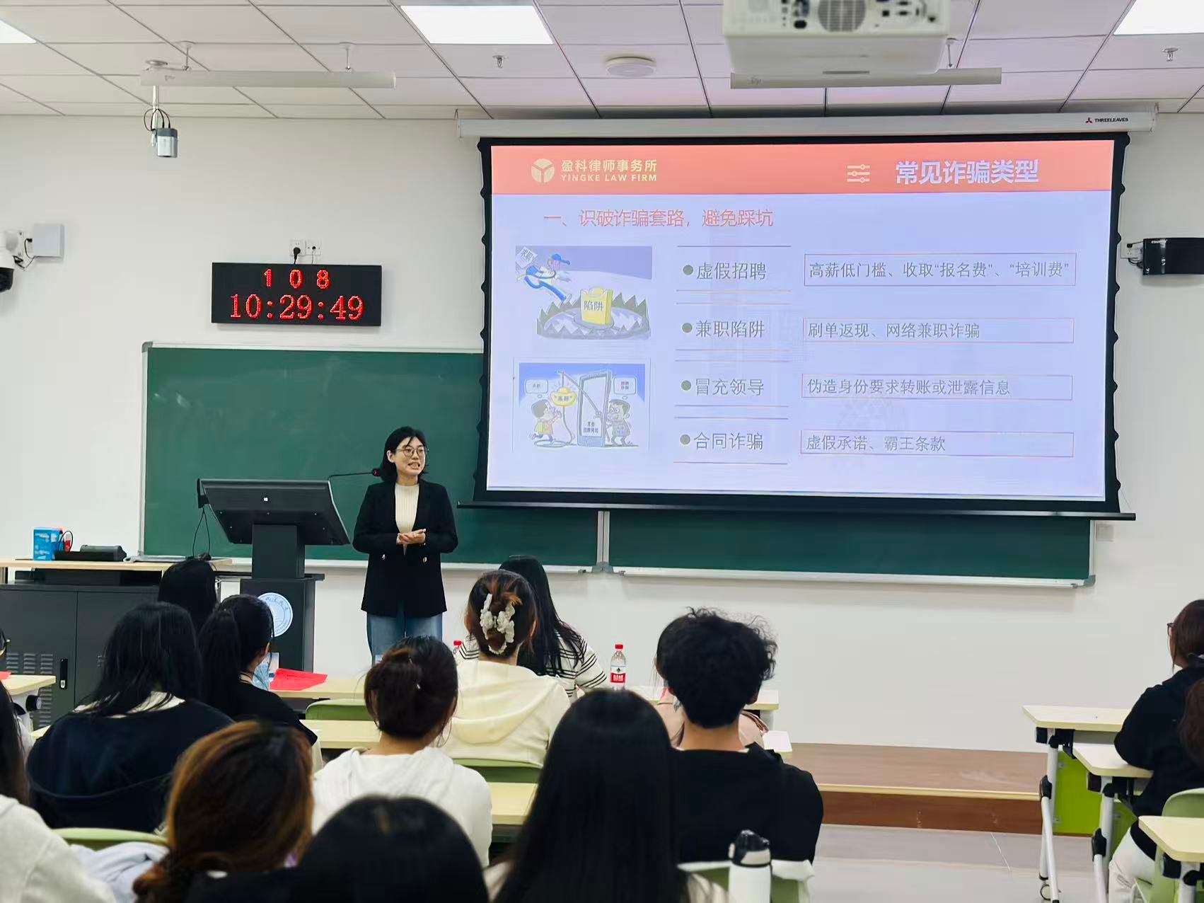 9月23日,学院特邀北京市盈科(石家庄)律师事务所实习人员专业委员会副主任贾克然律师作《从校园到职场——法治护航你的成长之路》专题讲座。贾克然律师针对“预防职业诈骗”这一关键话题,结合近年法律行业典型诈骗案例,揭露了“虚假实习岗位”“伪造律所录用通知”“代理合同陷阱”等职业风险,详细讲解了诈骗分子的话术套路与伪装手段,给出四方面防骗实用技巧:“核实信息”、“谨慎签约”、“保护隐私”、“及时报警”,有效帮助同学们筑牢职业安全防线。