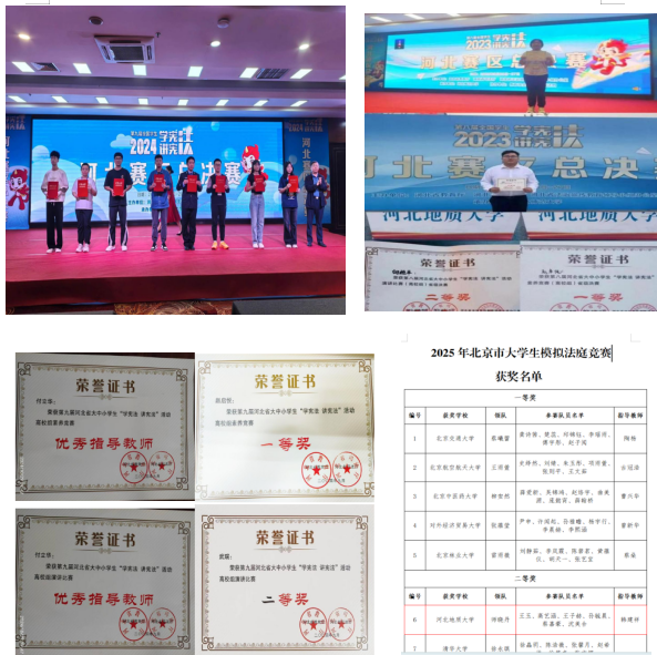 通过上述一系列法治教育举措,学生的法治素养得到显著提升。法政学院在各类法律知识竞赛中屡获佳绩;在河北省大中小学学生“学宪法 讲宪法”中,代表学校获得素养竞赛和演讲比赛成绩名列前茅;在北京模拟法庭大赛中荣获前三,在全国法律文书写作大赛中成绩斐然。