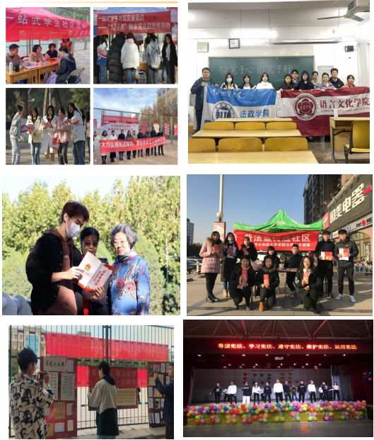 学院开展丰富实践活动,提升学生法治应用能力。包括法律知识竞赛、法治主题演讲比赛、法治文艺汇演、法治征文比赛等。建设专门模拟法庭,定期组织模拟法庭活动。选取具有代表性的大学生法律纠纷案件,模拟法庭审判全过程,有效提升学生的法律实践能力和法律职业素养。组织学生成立法律志愿服务队,深入社区、中小学、企业等开展法律宣传和咨询服务。每年举办的校园“12.4”国家宪法日宣传日。