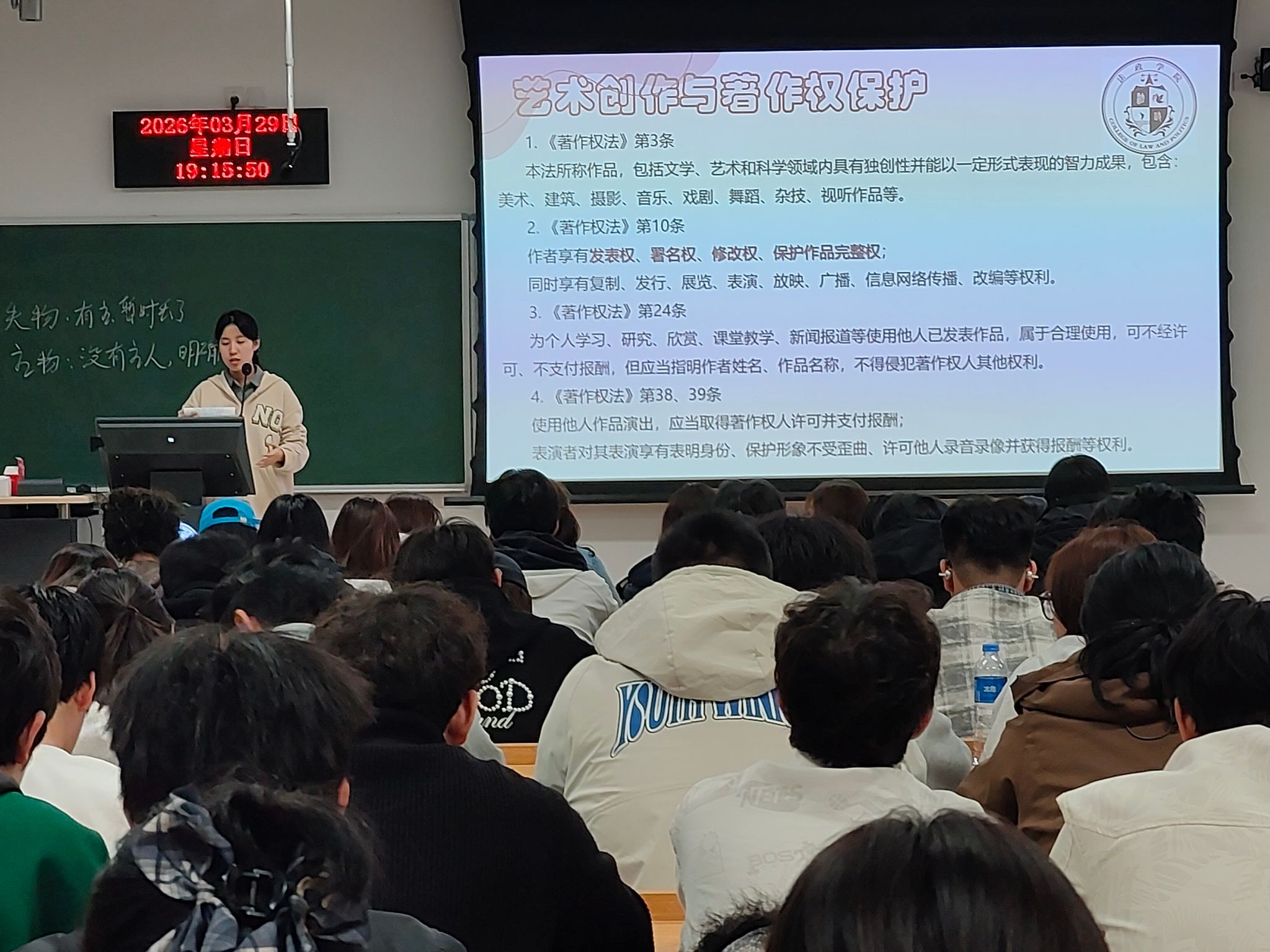 此次跨学院普法宣讲,将法治理论与艺术实践紧密结合,内容贴合学习与创作实际,为今后规范创作、合法传播、理性发声提供了重要指引,促进同学们增强法治素养,推动以专业赋能青年成长,共同营造尊法、学法、守法、用法的良好校园氛围。
