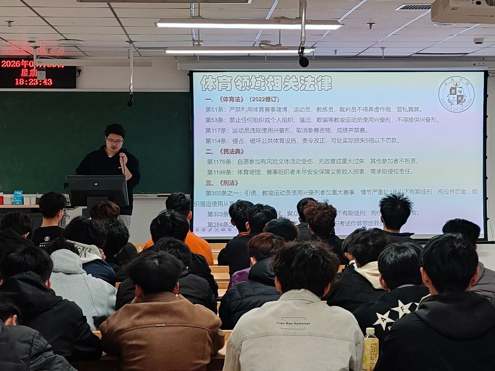 宣讲立足法治建设宏观局面,系统介绍了我国以宪法为核心的法律框架、立法层级与核心法治原则,深入浅出阐明法治在国家治理、社会运行、校园管理及体育竞技中的基础性保障作用。结合体育专业注重规则、崇尚竞技的特点,重点引导学子树立牢固的规则意识、法治思维与底线思维,让学子深刻认识到法治既是赛场竞技的准则,也是个人成长的基石。