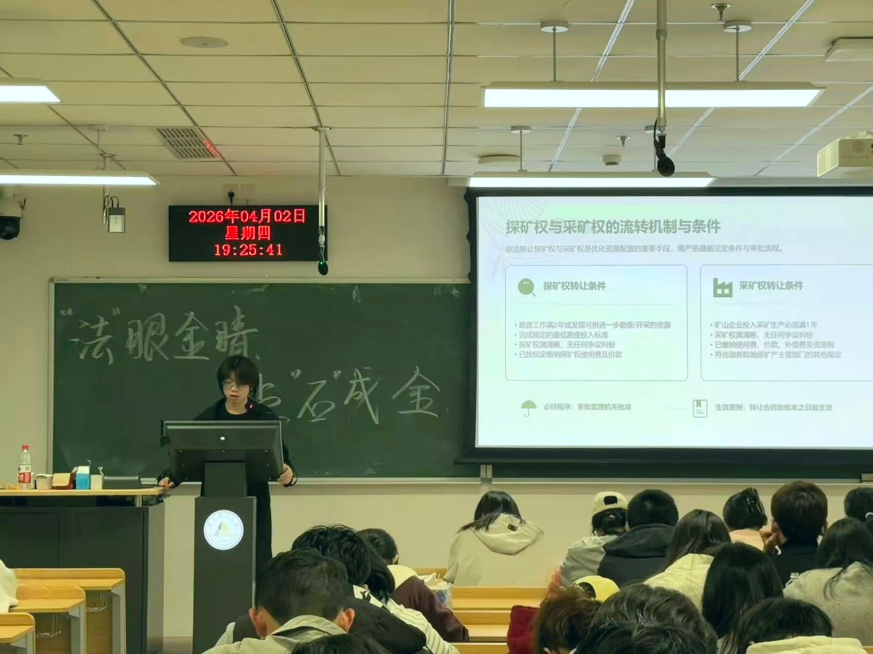 讲座以学科交叉为核心,围绕自然资源开发权属、知识产权法律保护、生态保护与法律责任、行业风险防范、可持续发展等内容展开,兼顾法学专业实践应用与宝石材料专业合规需求。讲座从我国宪法与资源法律体系切入,系统阐释自然资源国家所有、探矿权与采矿权管理、生态保护红线、环境影响评价等核心制度,结合典型司法案例,将法律规则与行业实践紧密结合,让两院学生在专业互通中拓宽视野、提升能力。在知识产权保护模块,讲座结合《民法典》、《专利法》、《商标法》、《著作权法》等法律法规,全面讲解专利、商标、著作权、商业秘密的保护路径与实务要点,既为材料研发、珠宝设计、工艺创新提供全链条法律保障,也为法学专业学生提供资源与知识产权领域的实务训练,实现理论与实践同频提升。